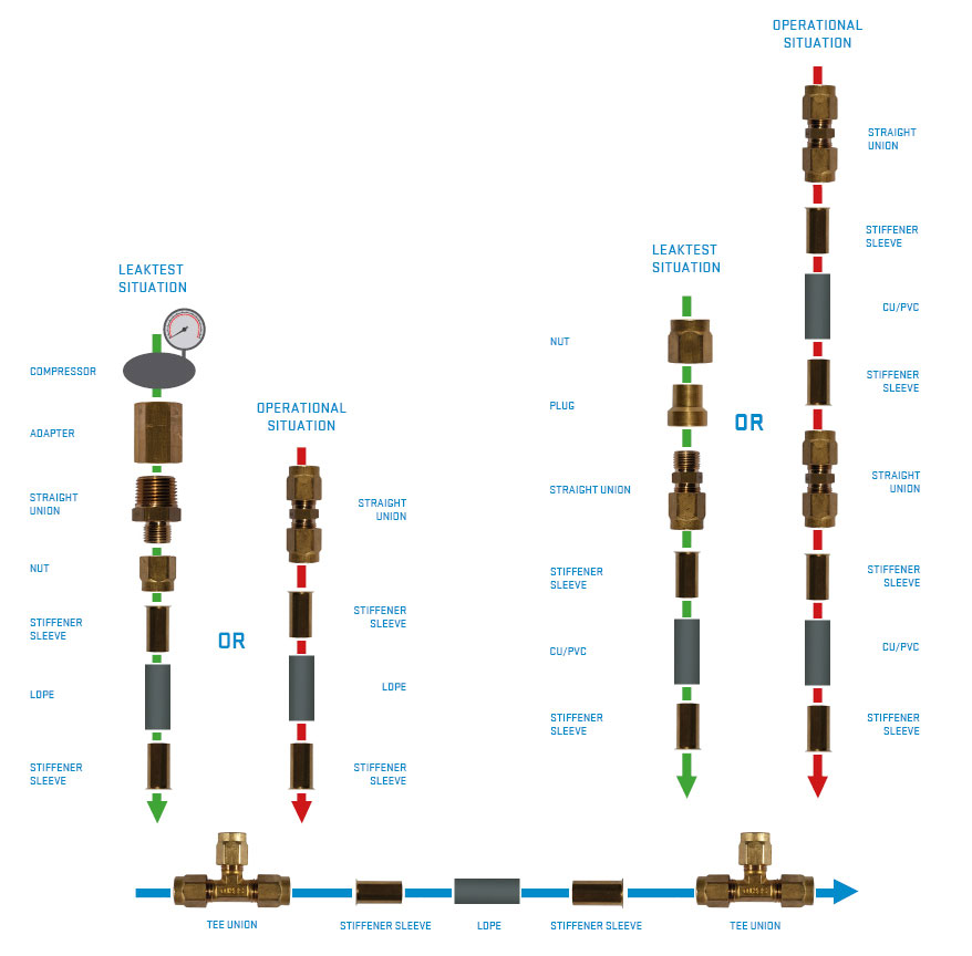 在此应用中使用了CU/PVC管及LDPE管。LDPE管若融化了就意味着有火灾发生。Serto黄铜接头是用于管线和不同区块的连接,以及连接到加压单元来使用。